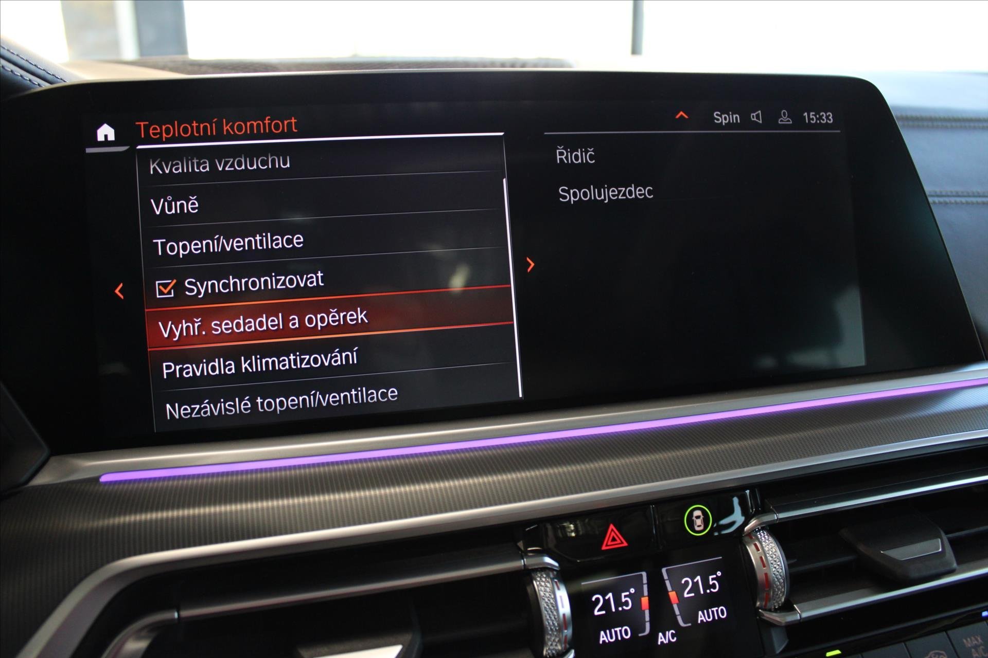 | Vnitřní výbava a komfort | Ambientní LED osvětlení interiéru, Klimatizace aut. , Bezklíčkové ovládání, Klimatizace čtyřzónová, Deaktivace airbagu spolujezdce, El. sklopná zrcátka, El. parkovací brzda, Kožené čalounění, Multifunkční volant, Nastavitelný volant, Nezávislé topení, Posilovač řízení, Malý kožený paket, Senzor opotřebení brzd. destiček, Senzor stěračů, Senzor tlaku v pneumatikách, Síťka mezistěny zavazadlového prostoru, Střešní okno, Venkovní teploměr, Vnitřní teploměr, Vyhřívaná zrcátka, Vyhřívané čelní sklo, Vyhřívané trysky ostřikovačů skla, Vyhřívaný volant, Zadní loketní opěrka |