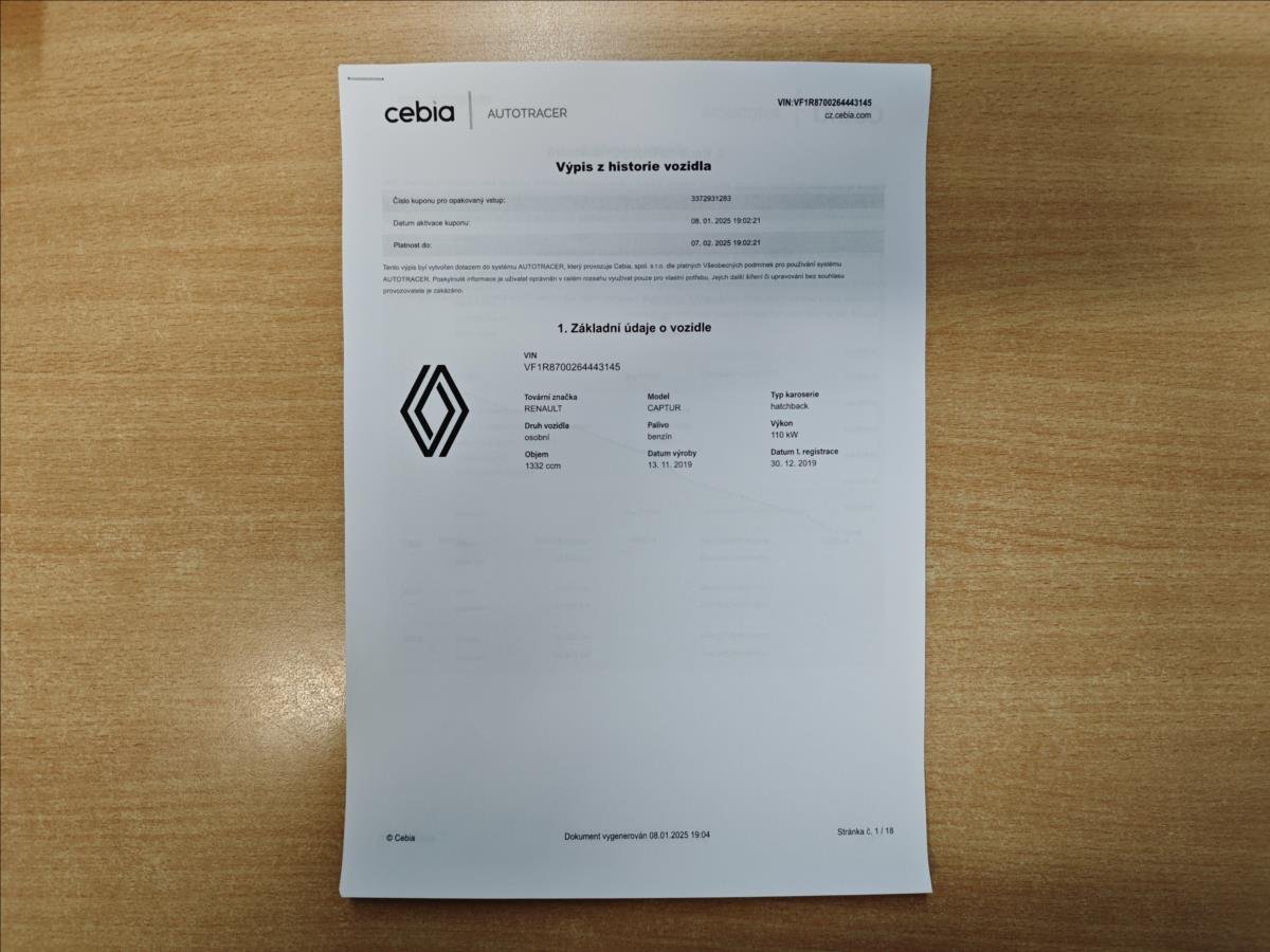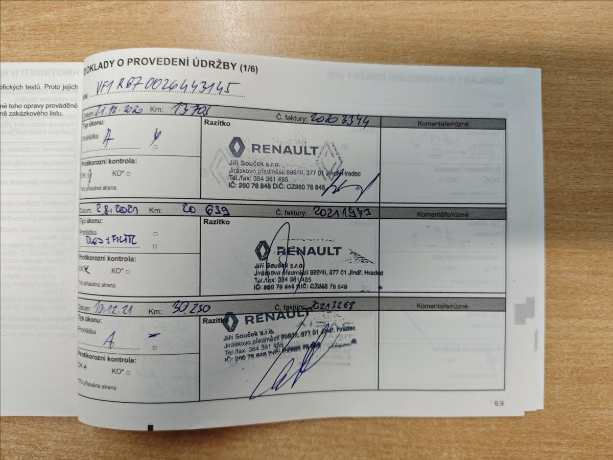 První majitel; Mimořádně zachovalý vůz po prvním majiteli; koupený nový a pravidelně servisovaný v Renault - Jiří Souček s.r.o.; nehavarovaný ani jinak lakovaný; servisní kniha + veškeré faktury za servisní prohlídky; poslední servisní prohlídka 7/2024 v 63.673km (motorový olej+filtr; vduchový filtr; pylový filtr; zapalovací svíčky; chladící kapalina; přední brzdové kotouče+desky). Doložený stav tachometru; 2x klíče; vše plně funkční. Sada pěkných letních pneumatik k vozu.