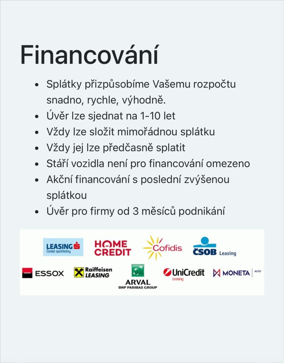 Vnitřní výbava a komfort Klimatizace aut. , Klimatizace dvouzónová, El. sklopná zrcátka, Multifunkční volant, Nastavitelný volant, Posilovač řízení, Senzor opotřebení brzd. destiček, Venkovní teploměr, Vyhřívaná zrcátka