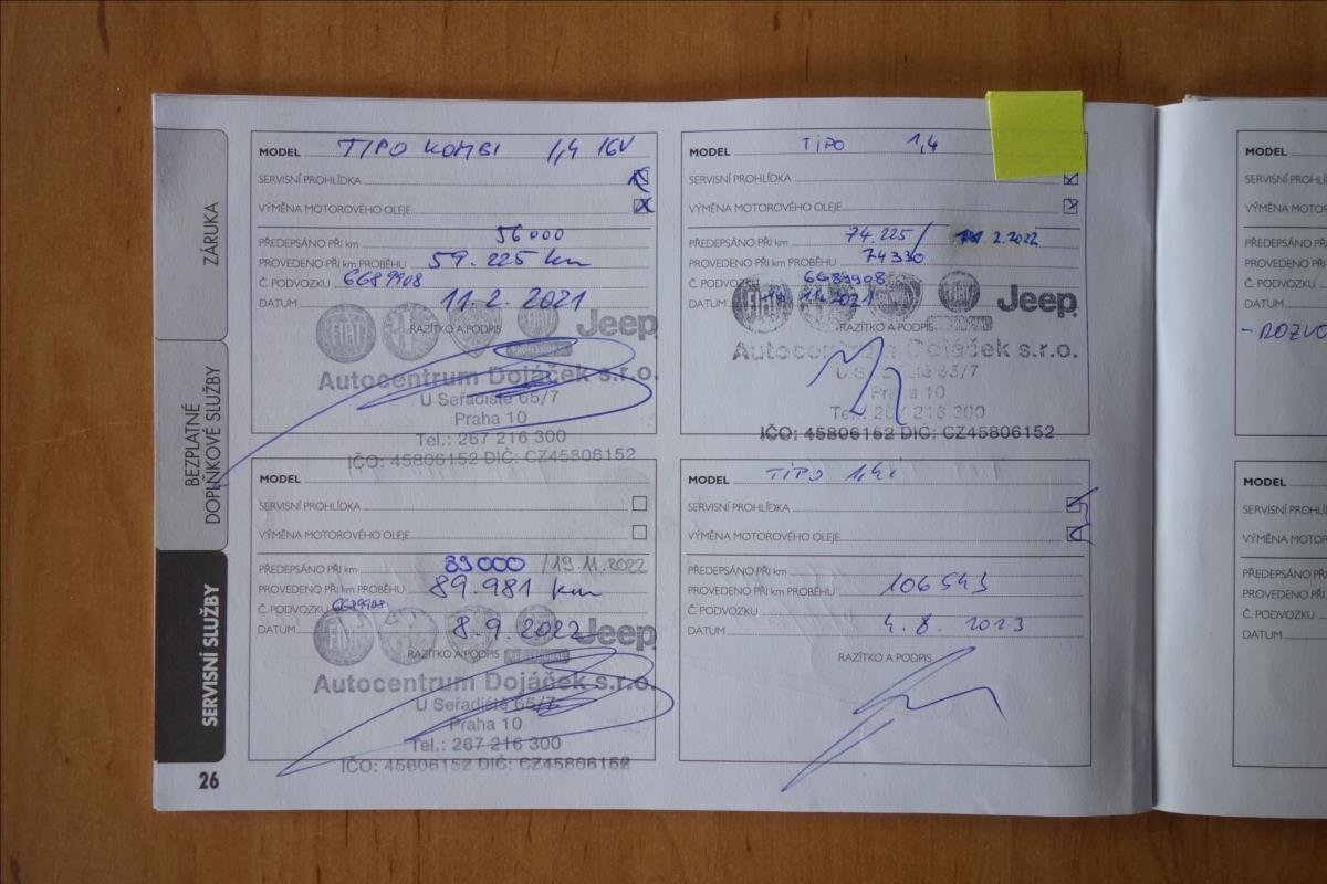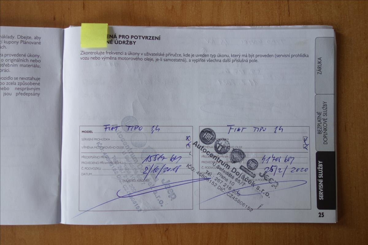 První majitel; Vůz servisován pouze v autorizovaném servisu FIAT.