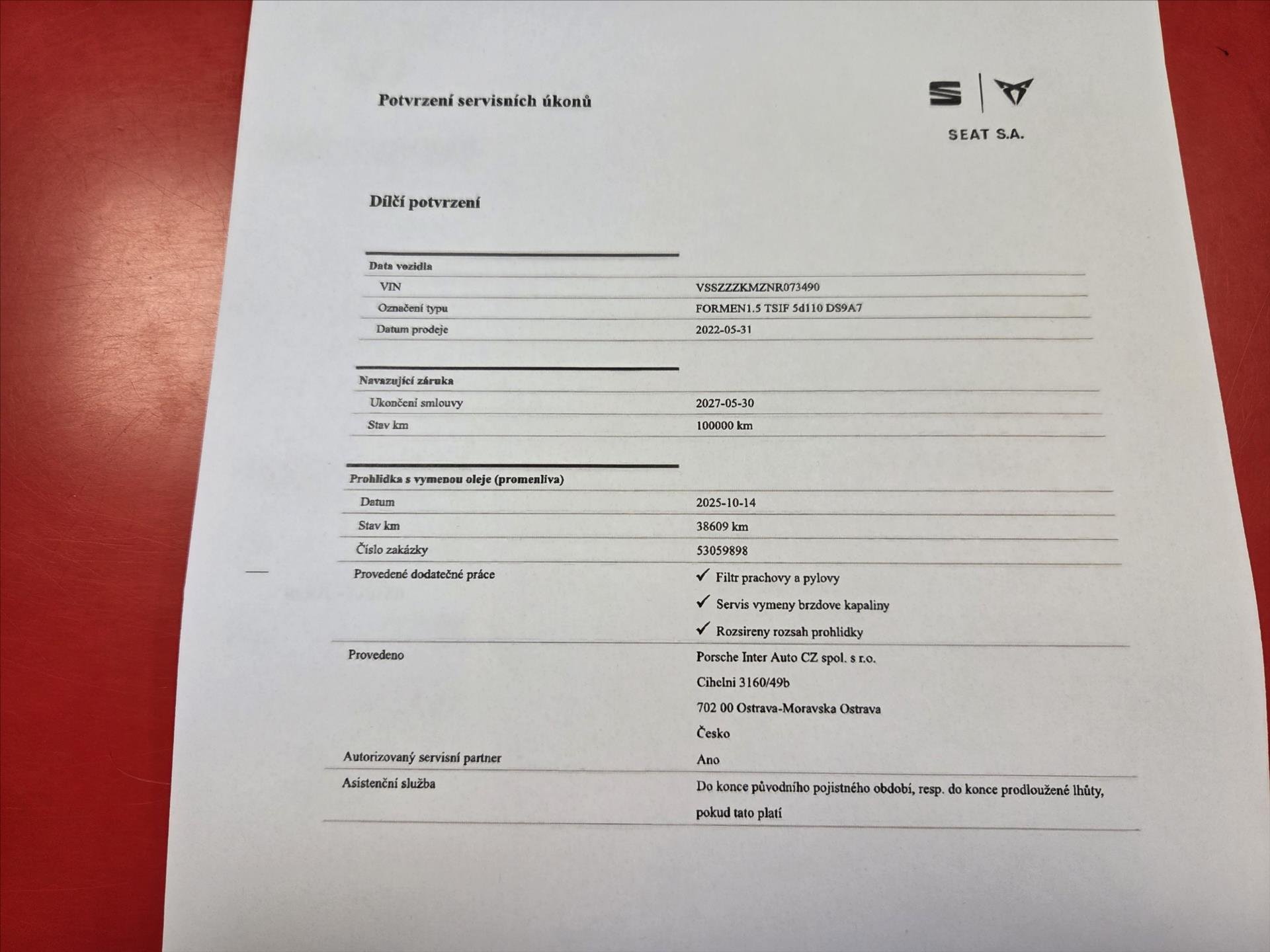 První majitel; Spotřebitelský úvěr možný; V PŘÍPADĚ FINANCOVÁNÍ NAŠIMI PARTNERY AKČNÍ SLEVA AŽ 20.000Kč. VIN: VSSZZZKMZNR073490. Poslední servis: 38.609 km 14/10/2025. Vůz je v záruce Porsche Česká republika s.r.o. do 30/05/2027 nebo ujetí 100.000 km. NEHAVAROVÁNO.