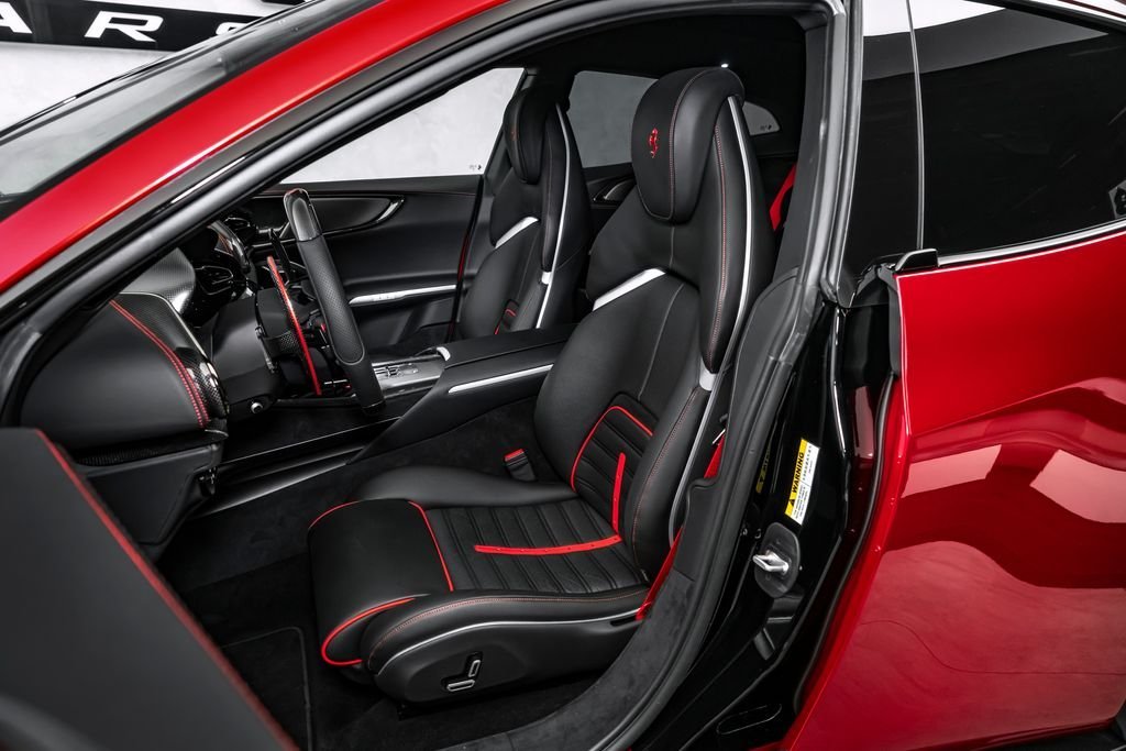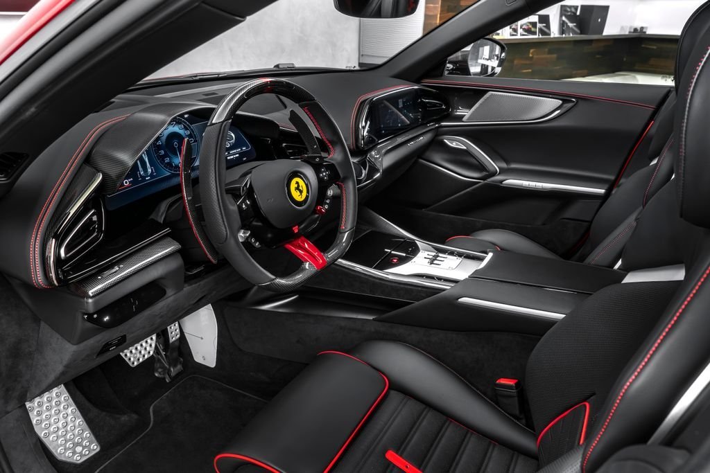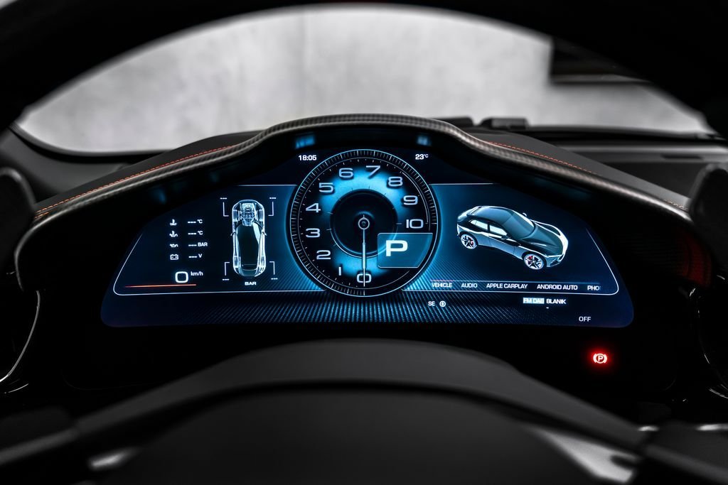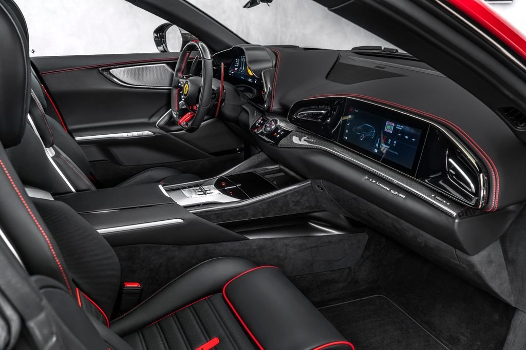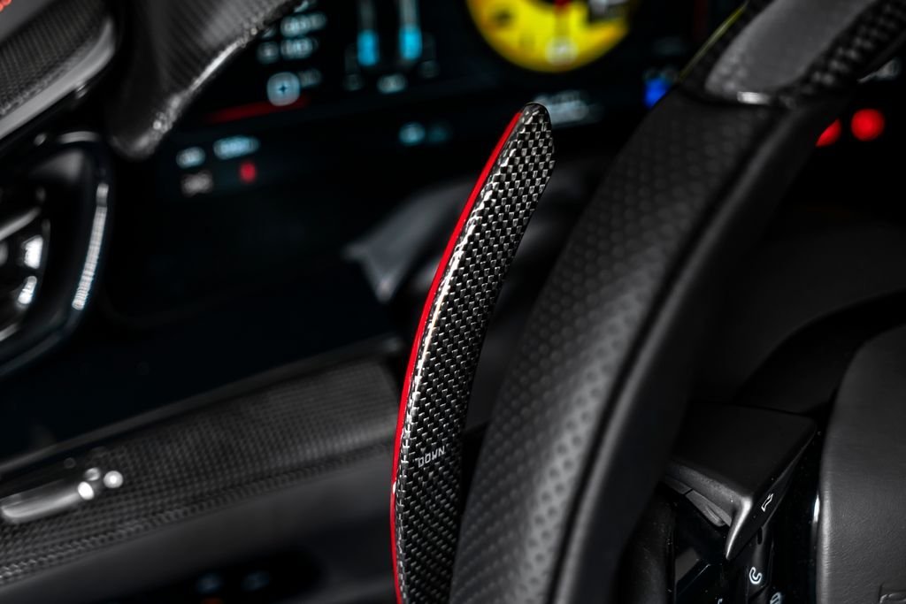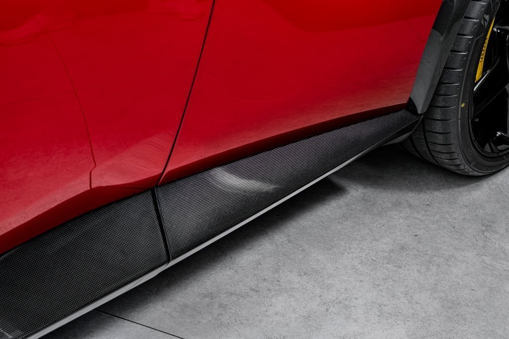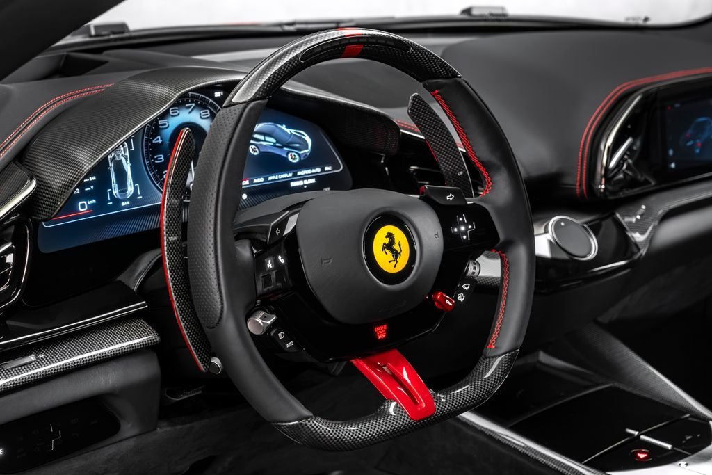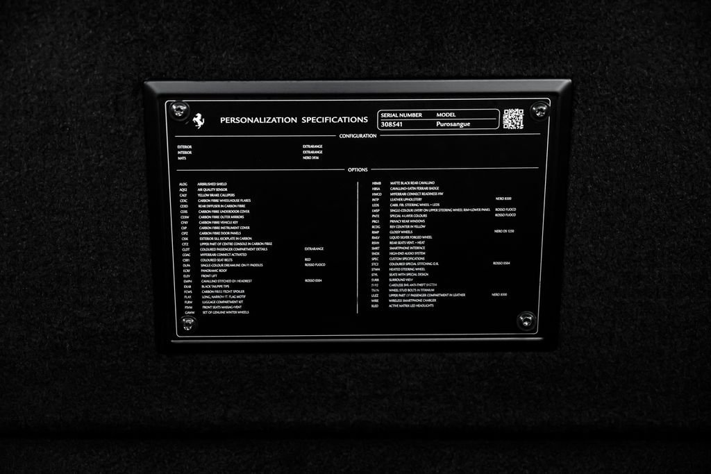 Ostrava; Airbrush shield; air quality sensor; yellow brake callupers; carbon fibre wheelhouse flares; rear diffuser in carbon fibre; carbon fibreouter mirrors; carbon fibre vehicle key; carbon fibre instrument cover; carbon fibre door panels; exteriour sill kickplate in carbon; upper part of centre console in carbon fibre; coloured passenger compartment details; myferrari conncet activated; coloured seat belts; single-colour dreamline on F1 Paddles; panoramic roof; front lift; cavallino stitched on headrest; black tailpipe tips; carbon fibre front spoiler; long narrow it. Flag motif; luggage compartment kit; front seats massag+vent; set of genuine winter wheels; matte black rear cavallino; cavallino+satin ferrari badge; myferrari connect readiness hw; leather upholstery; carb.fib. steering wheel + leds; single colour livery on upper steering wheel rim+lower panel; special 4-layer colours; privacy rear windows; rev counter in yellow; glossy wheels; liquid silver forged wheel; rear seats vent.+ heat; smartphone interface; high-end audio systém; custom specifications; coloured special stitching O.R.; heated steering wheel; seats with special design; surround view; cardless svr anti-theft systém; wheel stud bolts in titanium; upper part of passenger compartment in leather; wireless smartphone charger; active matrix led headlights