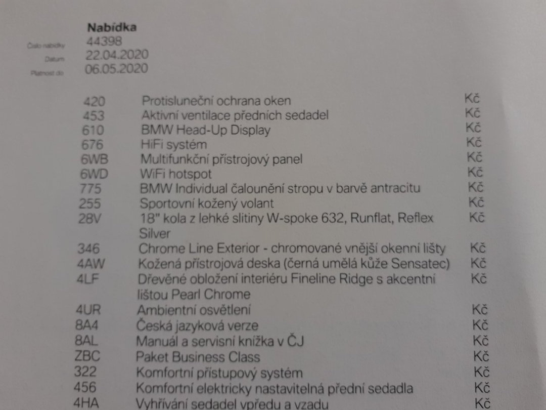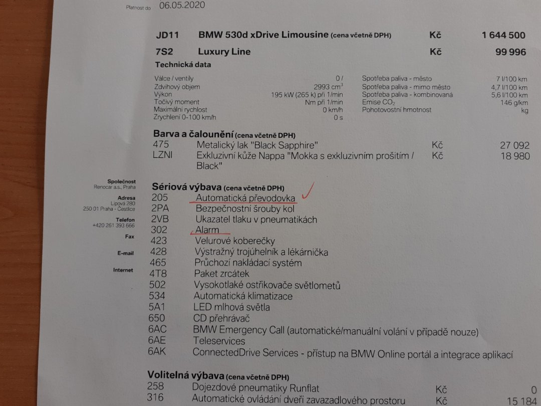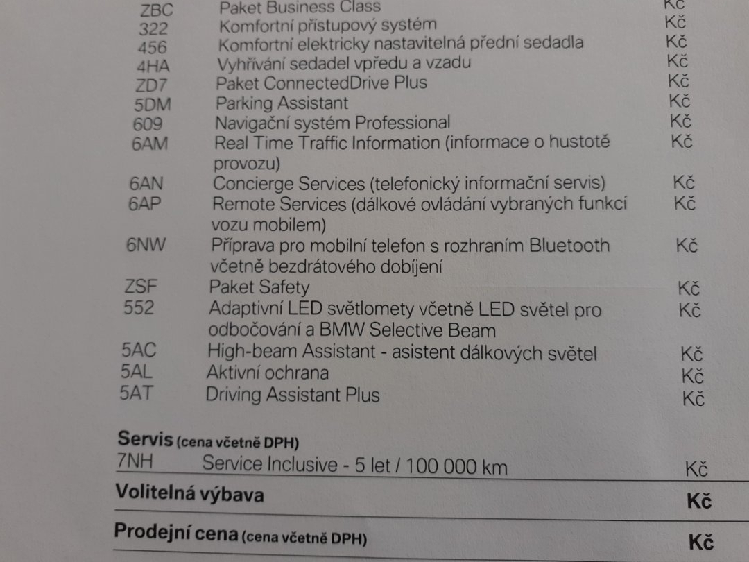 | Vnitřní výbava a komfort | Ambientní LED osvětlení interiéru, Bezklíčkové ovládání, Deaktivace airbagu spolujezdce, El. ovládání oken, El. ovládání zrcátek, El. ovládaný kufr, El. parkovací brzda, El. sklopná zrcátka, Elektrochromatické vnitřní zpětné zrcátko, Klimatizace aut. , Klimatizovaná přihrádka, Kožené čalounění, Multifunkční volant, Nastavitelný volant, Posilovač řízení, Senzor stěračů, Senzor tlaku v pneumatikách, Venkovní teploměr, Vyhřívaná zrcátka, Vyhřívaný volant |
