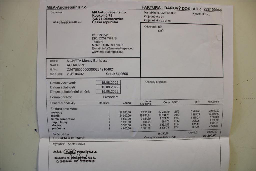 Druhý majitel; STK 1/2028; v roe 2020 dělán velký servis včetně rozvodů a oprava hydroměniče převodovky. 267tis. - běžný servis (olej a filtry.) 270tis. - chladič EGR; klínové řemeny; napínák; přední kotouče a přední brzdové desky. 275tis. - rozvody; repas hydroměniče; výplach automatu; zámek volantu ve sloupku řízení; nový klimakompresor. 280tis. - běžný servis + výměna oleje v pohonu Quattro. 290tis. - běžný servis + zadní kotouče a zadní brzdové desky; výměna kabeláže na el. ruční brzdu. 301tis. - běžný servis. 312tis. - běžný servis. 323tis. - běžný servis + výměna škrtící klapky; repase ventilu topení.