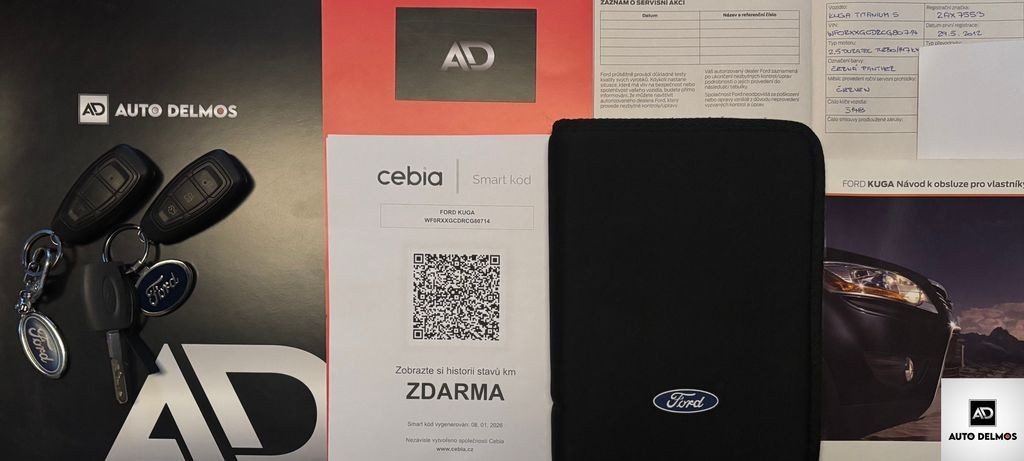 VIN:-WF0RXXGCDRCG80714--Ford Kuga 2.5T 147KW/2013/AT-4X4-TITANIUM-ČR; 1MAJITEL--ZÁRUKA 24MĚSÍCŮ-Vůz po 1. majiteli; provoz ČR; servisní kniha. Pravidelný servis v síti autorizovaných servisů veden po celou dobu provozu POSLEDNÍ SERVISNÍ PROHLÍDKA PROVEDENA 108.600KM; NOVÉ ROZVODY V 98TIS KM; možnost výhodného financování vozu a prodloužené záruky až na 36.měs. Certifikát najetých kilo; roku výroby a původu vozu od nezávislé společnosti CEBIA; DEKRA; FORD. Udržovaný a zachovalý stav; Další informace naleznete na www.DELMOS.cz. nabídka není nabídkou ve smyslu §1731 nebo §1732 občanského zákoníku; PROVOZ 7/2012 KŮŽE; BEZKLÍČOVÉ STARTOVÁNÍ; SADA ZIMNÍCH ALU KOL -MNOHO EXTRA CEBIA DEKRA --Kód kuponu: 3542545964--https://cz.cebia.com/?s_coupon=3542545964