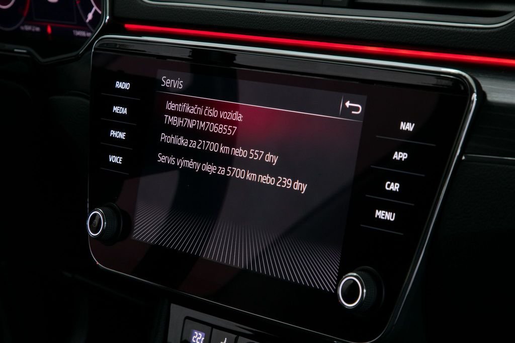 VIN TMBJH7NP1M7068557. Vozidlo od autorizovaného dealera Škoda; původem z Německa po 1. majiteli. Servis pouze v autorizovaném servisu Škoda doložitelný servisní knihou. Garance počtu najetých km a původu v kupní smlouvě. K vozu veškerá palubní dokumentace; servisní kniha; 2x klíč od vozidla. Výbava Style; Interiér v provedení látka; Matrix LED světlomety; El. nastavitelná přední sedadla s pamětí; Sound system Canton; Akustická přední postranní skla se SunSetem; Kessy - Bezklíčové odemykání a startování; Zadní víko s el. otevíráním a zavíráním; Virtual Pedal - bezdotykové otevírání pátých dveří; Dvouzónová automatická klimatizace; Vyhřívaná přední sedadla; Vyhřívaný volant; Virtual Cockpit - digitální budíky; Přední a zadní parkovací senzory; Barevné ambientní osvětlení interiéru; Navigační systém Amundsen; SmartLink - Android auto/Apple CarPlay; Zásuvka 230V; Alarm s hlídáním vnitřního prostoru; Originální litá kola R16. MOŽNÝ ODPOČET DPH.