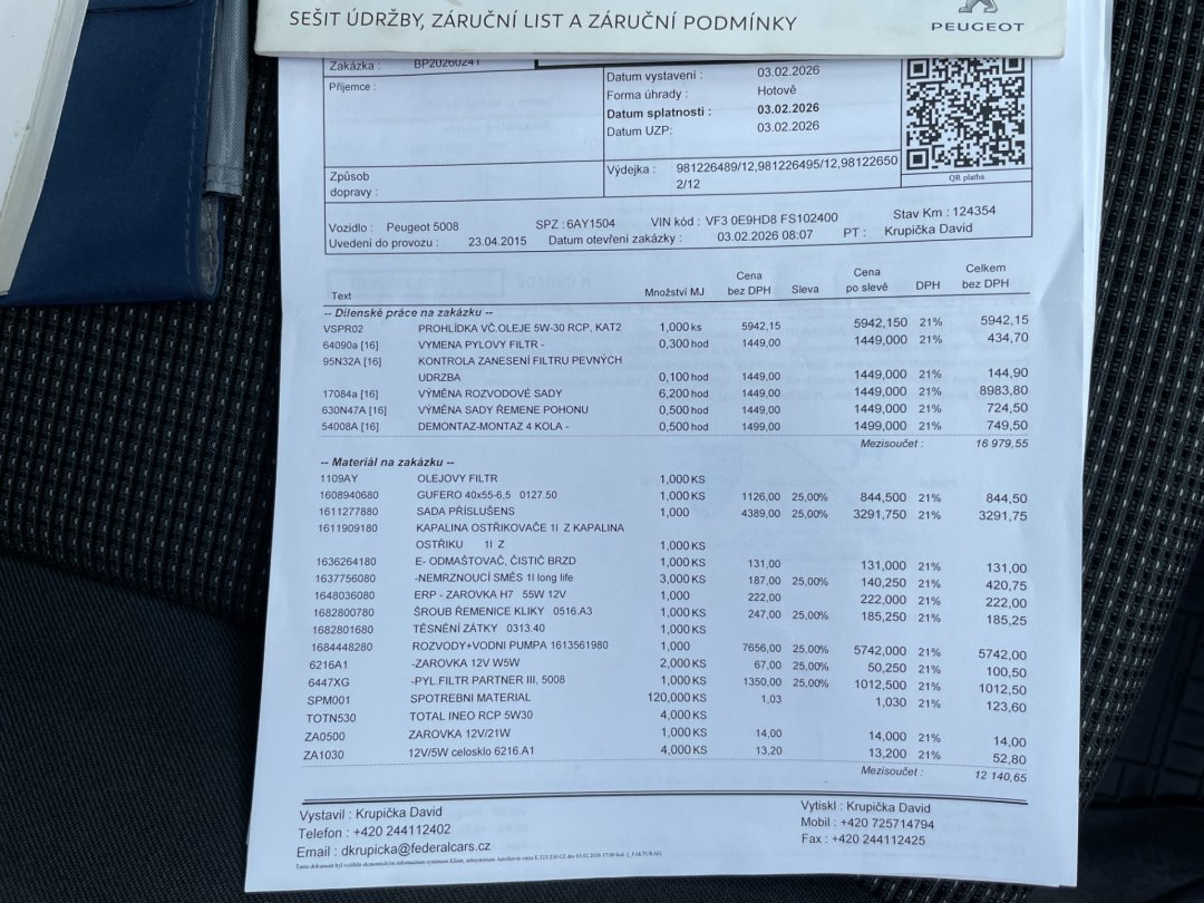 Nehavarovaný vůz koupený nový v České republice. Po celou dobu pouze autorizovaný servis Peugeot! 3.2.2026 při 124.354 provedena výměna ROZVODŮ, oleje a filtrů!!! Zánovní obutí! Platná dálniční známka do 31.01.2027! Nyní vůz naprosto bez investic! Verze motoru originál z výroby BEZ AdBlue!! 7mi místné provedení. Krásná bílá perleťová metalíza. Bohatá výbava: LED denní svícení, dvouzónová automatická klimatizace, parkovací senzory, tempomat, senzor stěračů a světel, zatmavená skla + roletky zadních oken, střešní nosiče Thule k vozu.