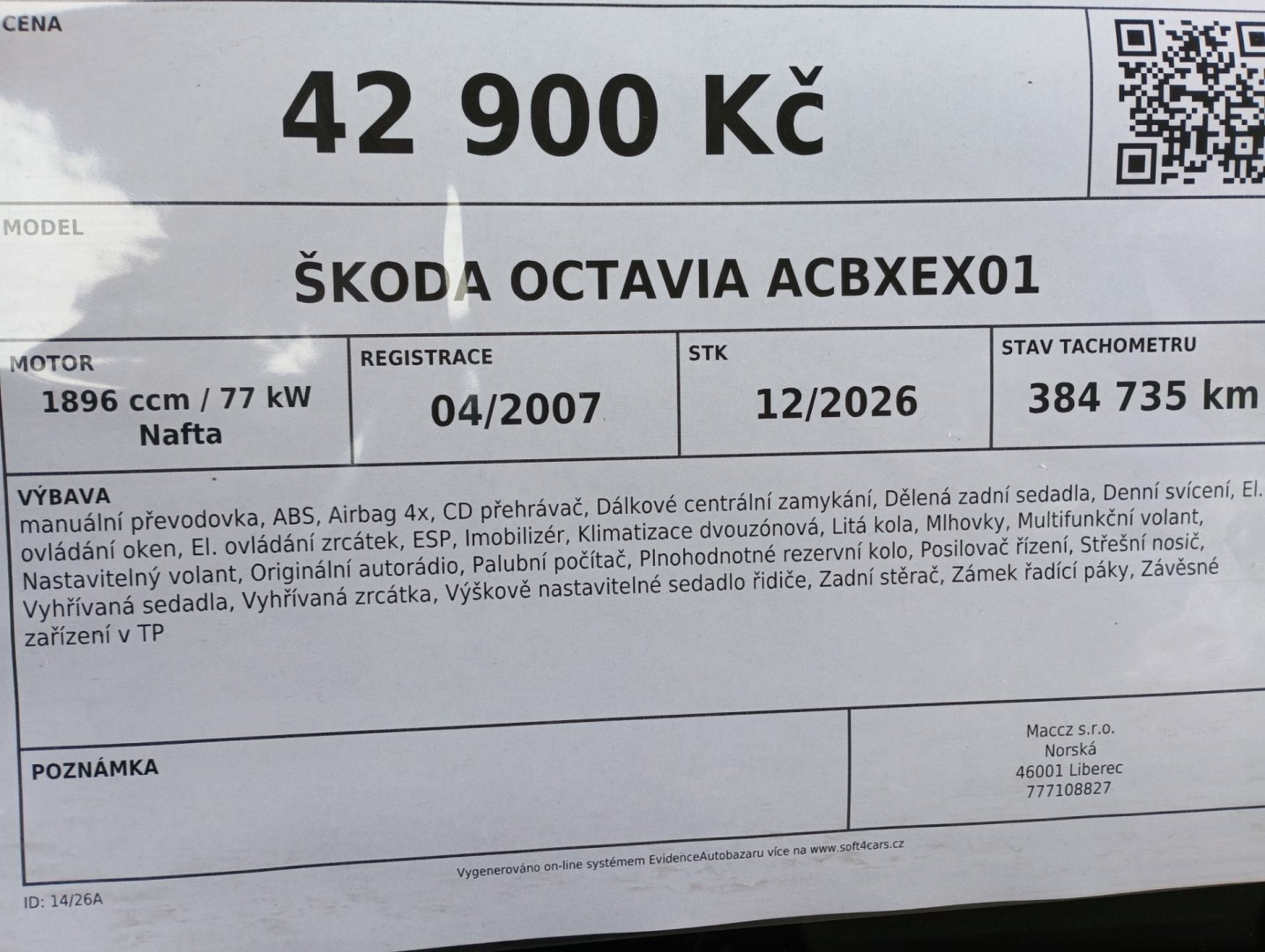 | Zabezpečení vozidla | Dálkové centrální zamykání, Imobilizér, Zámek řadící páky |