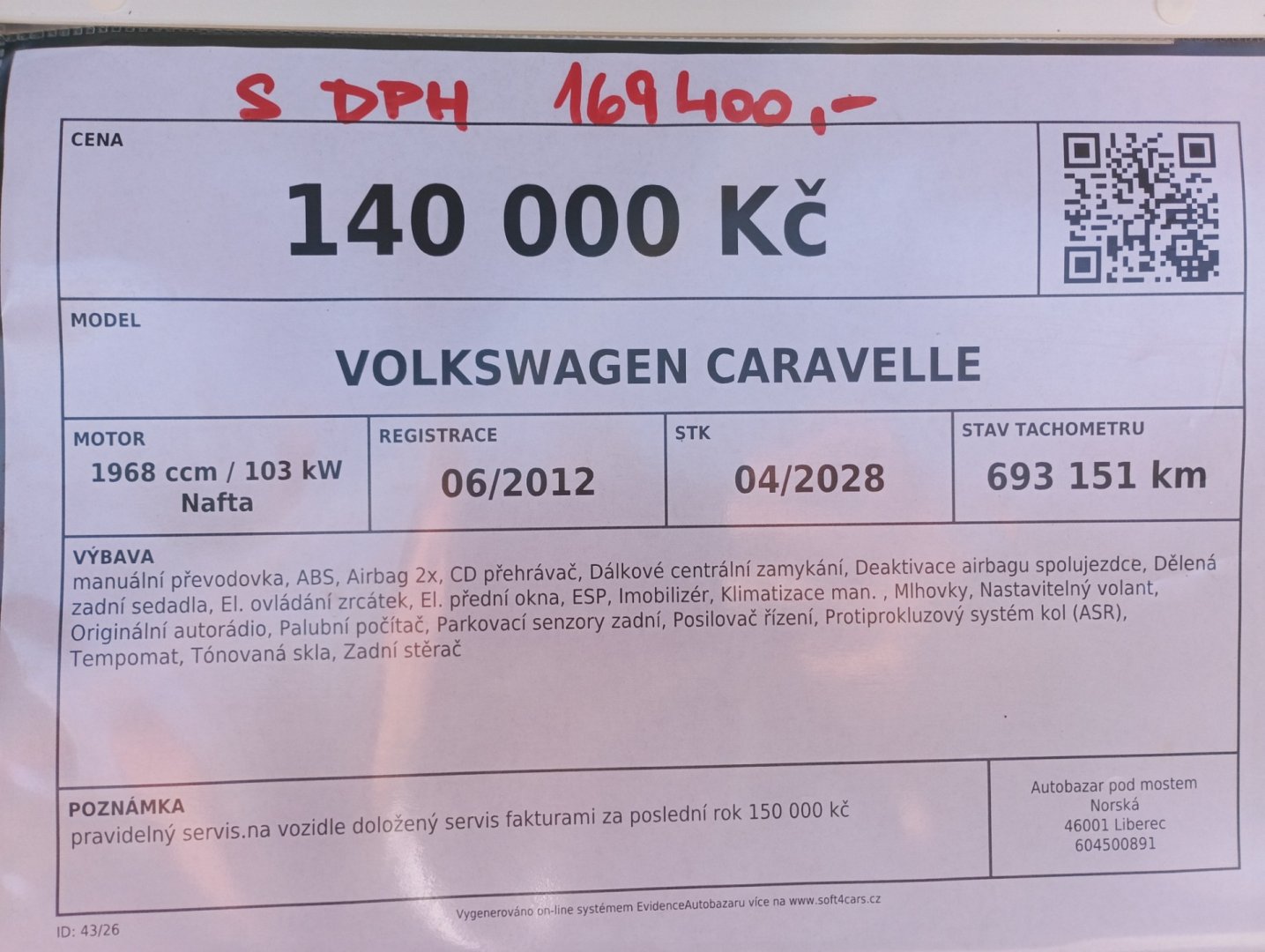 pravidelný servis.na vozidle doložený servis fakturami za poslední rok 150 000 kč